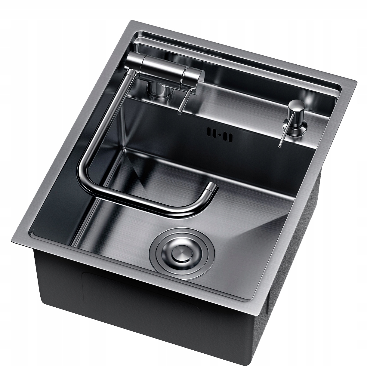 Chiuveta este echipată cu un robinet pliabil, un dozator pentru lichid și un sifon manual cu coș pentru resturi.