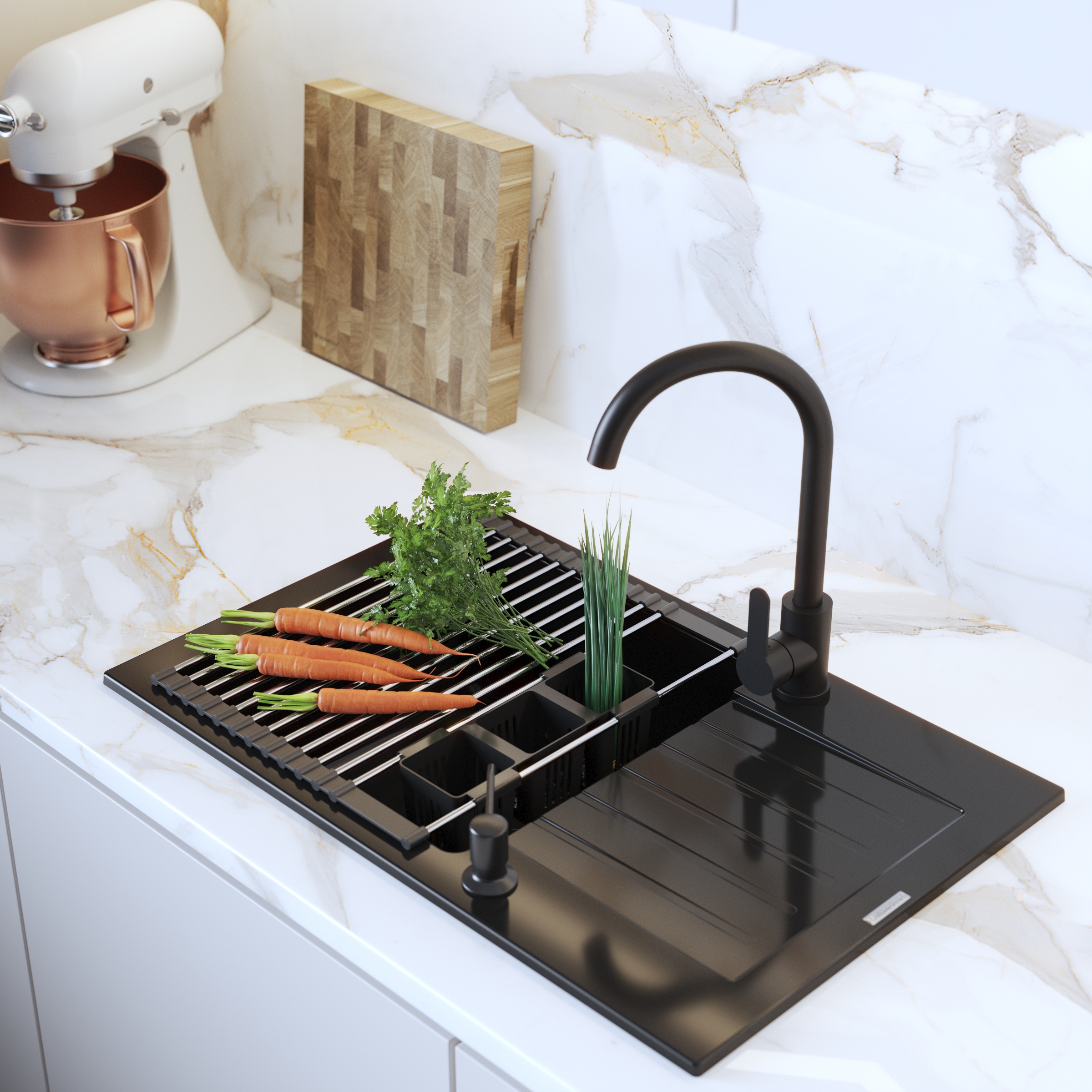 • Uscător pentru Legume și Fructe – spală și usucă produsele direct deasupra chiuvetei.
