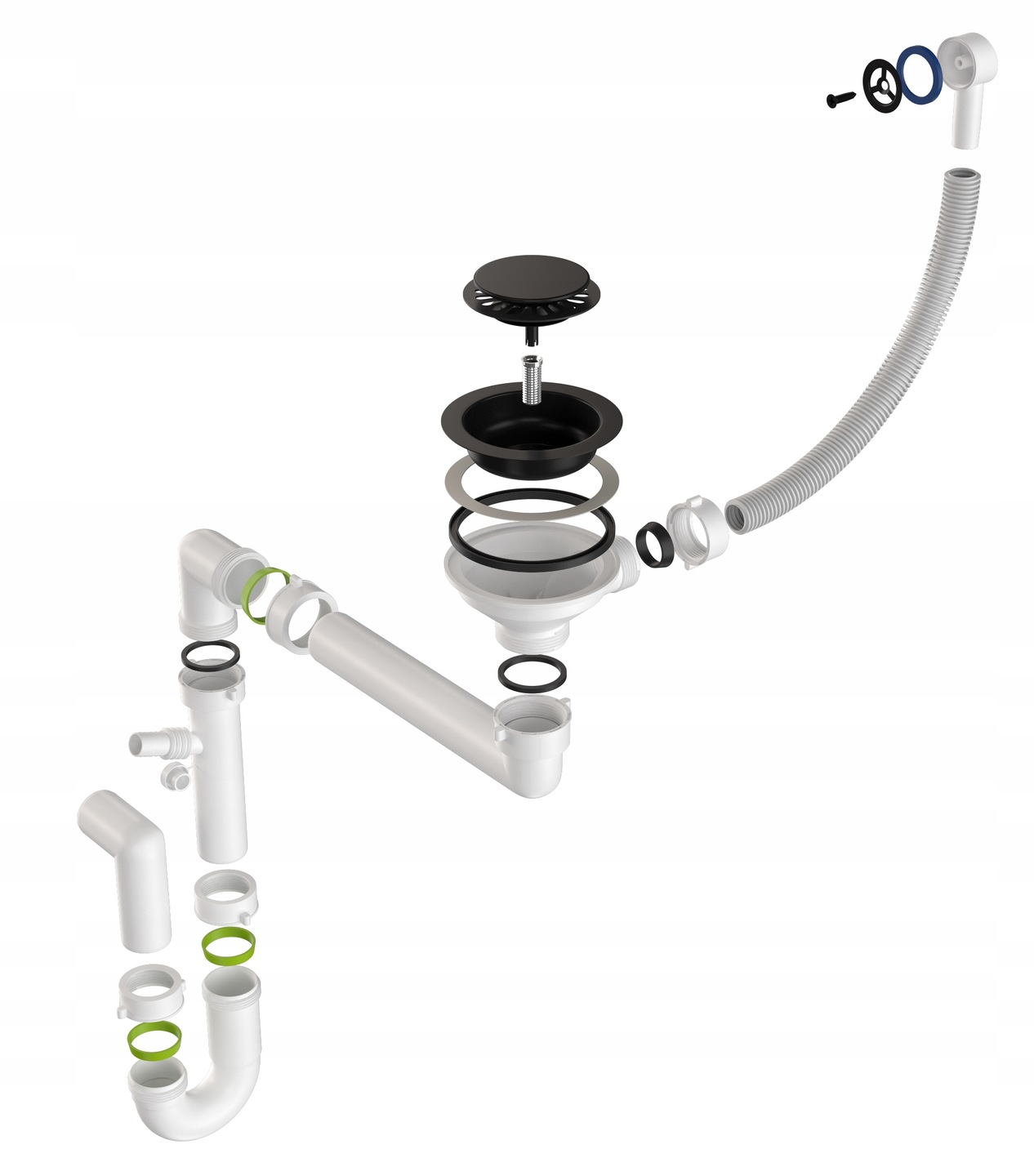 Sifonul, cu o construcție save space (economisește spațiu în dulap), dispune de o conexiune suplimentară dedicată pentru mașina de spălat vase sau rufe.